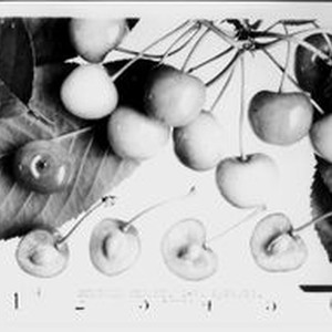 Identification of Luther Burbank cherry hybrid from the Gold Ridge Experiment Farm--cherry clusters (Burbank Cherry, I-7) and halved cherries, May 28, 1931