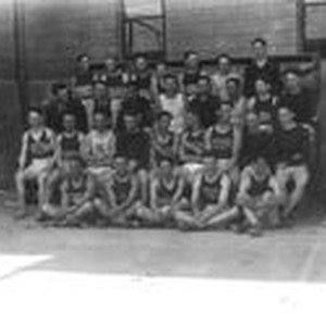 Photo -black and white: Analy Union High School basketball team of 1924. The team is seated on bleachers next to a building--probably the Analy gym.