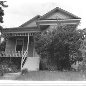 Photo, black and white: Sebastopol house at 7348 Healdsburg Avenue a Queen Anne cottage built in 1895. House photographed in 1993 by Evelyn McClure for her book "Sebastopol, California : History, Homes and People."