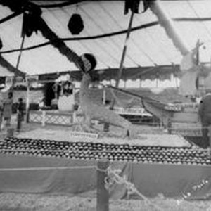 Photo--black and white, from Borba celluloid negative: Gravenstein Apple Show display by Forestville of a seal balancing a beach ball on its nose. In the background is a display by Santa Rosa which is a 17th century sail boat with the name "Sonora." J. F. Miller & Sons display to the left.
