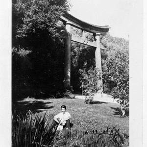 A view of the Torii Gate in the Japanese garden, with a young, smiling man seated on the grass in the foreground. The Torii gate was taken down due to disrepair during World War II and was never replaced. On verso:"Mr. Goto's old views". Probably Shige Goto, son of Chiyozo Goto, in front of the Torii gate, Huntington Garden. Per Richard Goto, Shige Goto's son.