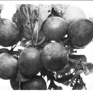 Photo, black and white: Plums on a branch. Handwritten on back: " O-13 "XXA? ." (circa 1928)
