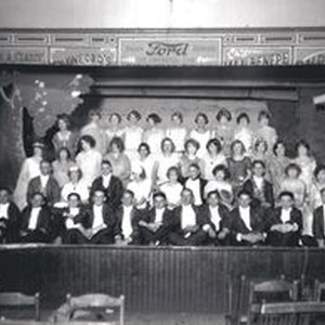 Photo--black and white: Analy Union High School 1925 yearbook photo of the Drama group assembled on stage. Both girls and boys are in make-up and costume. Advertisements on rolled curtain include: Crawford's, W. I. Benepe and Baldwin.