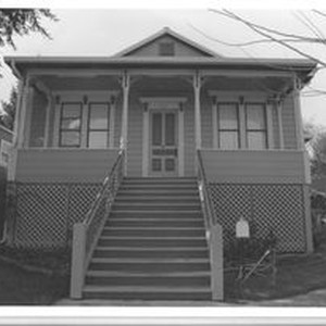 Photo, black and white: Sebastopol house at 672 South Main Street, Queen Anne cottage built in 1895 in the Calder Addition. House photographed in 1993 by Evelyn McClure for her book "Sebastopol, California : History, Homes and People."