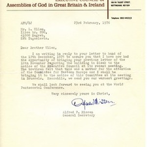A letter from Alfred F. Missen to Ludvik Üllen, a response to his previous letter from December 12, 1975 about the Pentecostal conference in Sisak, Croatia. [Description English/roman)] Pismo Alfreda F. Missena Ludviku Üllenu, odgovor na njegovo prijašnje pismo od 12. prosinca 1975. godine o pentekostalnoj konferenciji u Sisku u Hrvatskoj. [Description (original non-English/roman language/script)]
