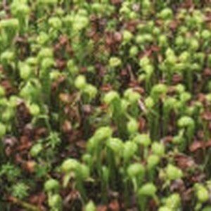 Cluster of bright green and wilted brown California pitcherplants.