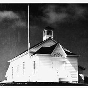 Photo--black and white: Freestone Schoolhouse following its restoration that began around 1973 by Gene Walker, T. Golden and J. Kidder . The school is now (2009) a Sonoma County Historic Landmark. Built in 1852 on the O'Farrell property on the western foot of O'Farrell Hill.