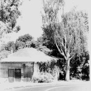 Photo black and white: Burbank cottage in disrepair with boarded doors and windows before restoration. Paved road in front is part of Burbank Heights Seniors housing. Burbank lived in Santa Rosa but used this cottage in Sebastopol as an office and workshop where the botanist kept detailed records of his extensive plant experiments on his 18 acre farm which he had purchased in 1885. The cottage was destroyed in the 1906 San Francisco Earthquake and was rebuilt by Burbank in 1907.