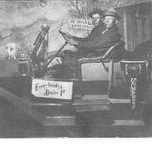 Staged photo of two people in a car at the 1912 Gravenstein Apple Show