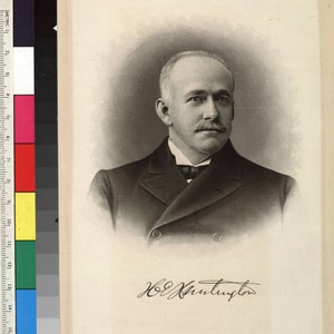 An engraved studio portrait of Henry E. Huntington with his signature underneath. MS note on envelope reads "HEH engraved portrait."