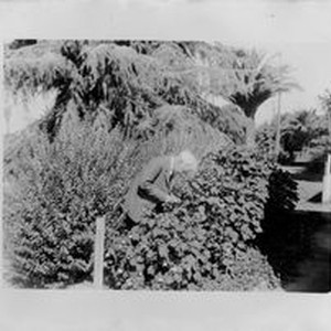 Photo--black and white: Luther Burbank, shown in 1925, hybridizing a flowering Maple. Typed caption is attached to photograph.