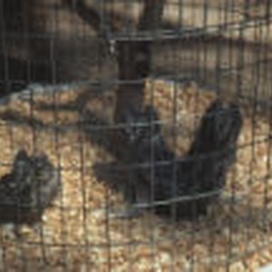 Young Western screech owls in a rehabilitation cage from the Raptor Project.
