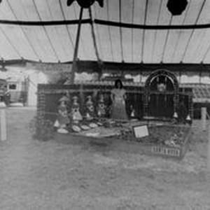 Photo--black and white, from Borba 8" x 10" celluloid negative: Gravenstein Apple Show display by Santa Rosa of the nursery rhyme "Mary Mary Quite Contrary." Girl manikins in a garden. A vintage truck to the left.