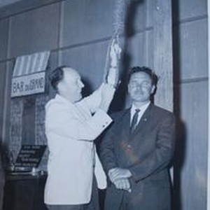 Photo--black and white: Sebastopol Lions Club scrapbook photo: Lions Club 'debunking' of Glenn Klineman with Jack Fore holding noose. Circa 1955
