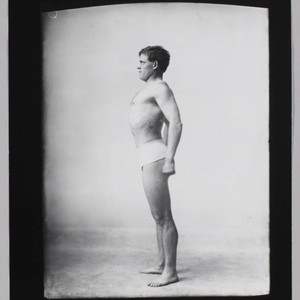 A full-length standing studio portrait of Jack London wearing only underwear. He is turned in profile to the left, with his chest pushed out and his hands by his sides. Title devised by cataloger, date based on another print that is in JLP 456 Alb. 18 (p. 18)