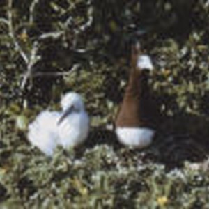 A booby with chick sitting among plants and branches.
