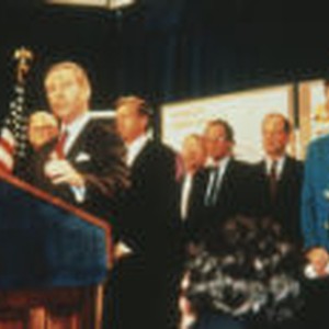 Gentleman speaking at podium, surrounded by supporting guests.