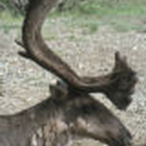Close-up of a kneeling caribou's head near the Eielson Visitor Center.