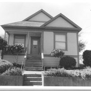 Photo, black and white: Sebastopol house at 316 West Street, a Queen Anne cottage built in 1905 in the Morris Addition House photographed in 1993 by Evelyn McClure for her book "Sebastopol, California : History, Homes and People."