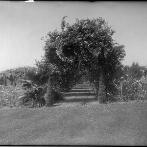 View of the rose arbor, completely overgrown and leaning slightly to the right. The label that accompanies this photo in the album reads "No. 113 Center arbor - rose garden, about 1918."