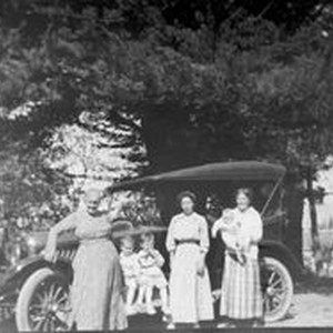 Photo--black and white, from Borba 8" x 10" celluloid negative: A group of three women and three children pose in front of a vintage car. Circa 1915.