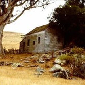 Slide, color transparency: Unidentified old barn, fence and Eucalyptus tree. 1982