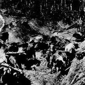 Photo--black and white: Eight yoke of oxen is shown working in the woods along the South Fork of the Gulala River. Ben Brians is the bull driver. Logs were hauled to the Bender Brothers sawmill located at Del Mar.