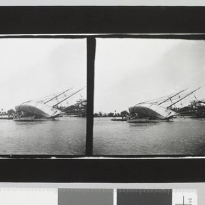 Bottom of two-masted sailboat near shore on its side. A small boat and a few people on dock sit along side it. Title and date transcribed from envelope. Copy print of original. Print has two of the same image side by side with different exposures.