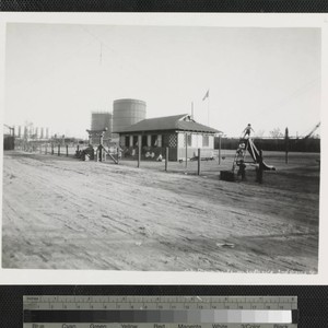 View of a fenced in dirt area with a building, park bench, slide, swings and American flag on Apablasa Street in Old Chinatown, Los Angeles. There are children playing in the area. Storage tanks of the Los Angeles Gas and Electric Corporation are in the background. Title transcribed from photograph. Note: The street name of "Apalabassa" is spelled incorrectly on the photograph, the correct spelling is "Apablasa".