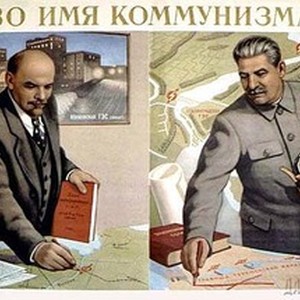 Soviet poster showing soviet leaders, Vladimir Lenin and Joseph (Iosif) Stalin. Caption reads, "Во имя коммунизма / Vo imia kommunizma", meaning, "In the name of communism". [Description English/roman)]