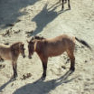 A horse and foal standing next to each other in the sand.