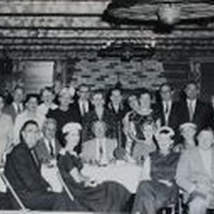 Photo, black and white: Oscar A. Hallberg attending a mostly directors Heart Association meeting at the St. Rose Hotel in Santa Rosa, 1956. Hallberg is seen on the far side of the table, to the left of the lady in the white hat and white collar.