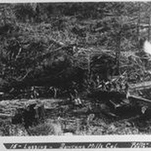 Photo--black and white: View of Dolbeer donkey steam engine, crew, and bull team in the woods logging at Duncan's Mills, CA . Pelton Photo 1899