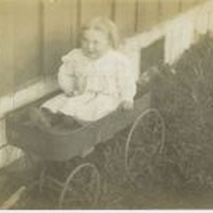 Postcard--black and white, photo: Girl baby in white dress seated in wagon in grass next to a house. Message on back. Postmarked Potter Valley Cal May 22, 1912.