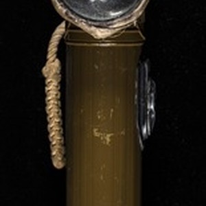 An Eveready brand flashlight belonging to Hiroshi Sugiyama. His name and identification number are inscribed in the metal rope clip.