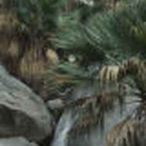 Some palm trees in a rocky area near a waterfall. Location is indicated as "waterfall, Borrego Palm Canyon, grove."