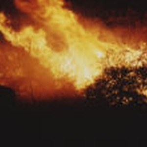 Close-up view of blazing fire with the shadow of a firefighter in the forefront.
