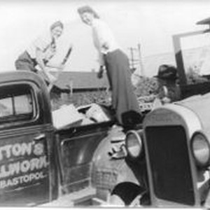 L-R: Mr. Kynian and Gloria Chaney at a World War II American Legion Scrap Drive November 14, 1942. The pick-up truck bears the business name "Hutton's Millwork, Sebastopol". Photo by James H. Cruse, brother of Mary Evelyn Panttaja.