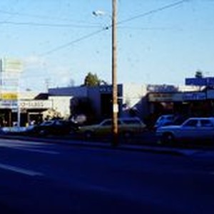 Print, color: The Magnolia Shopping Center with various stores. House O Glass, Sebastopol Pet Center, Barber Shop, Coin Laundry and Vern Hassett Radio & TV. Circa 1970s.