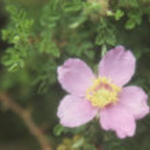 Close-up of pink flower with yellow center found among greenery.