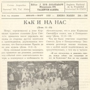 The Christian Herald was an informational organ of the Union of Pentecostal churches of "Assemblies of God" in South America. The journal was founded in August 1937 at the founding meeting of the Slavic Pentecostal churches of South America. Believers from Argentina, Paraguay, Uruguay and Brazil were present at the meeting. The purpose of the journal was to "carry unity and communication of the Spirit to the midst of believers in full Gospel". The journal united Pentecostal churches and became a link which connected believers scattered all over the world. Thus, letters of Christians of Evangelical faith from Germany, Belgium, France, the Netherlands, Canada, the United States, Uruguay, Paraguay, the Philippines, China, Australia and other countries were published in the journal journal. The first issue was published in Russia in October 1937. Subsequently, the journal spread to 40 countries where the Slavic diaspora lived. The headquarters of the journal was located in Buenos Aires. Juan Zub-Zolotarow was responsible for the journal. He was a permanent editor for 42 years. The journal was published for offerings of believers. Spiritually-edifying and theological articles of Donald Gee, Alfred Goets, R. Bratslavsky, N. Vodnevsky, D. Bespalov were published in the journal. On the last pages, as a rule, information from local churches and the mission and evangelical fields of North and South America, Canada, Africa, Australia, India, Europe and China was published. Thus the activity of such evangelists as Oral Roberts, Billy Graham, T. Giks, and William Brankham was reported in detail. [Description English/roman)] Христианский Вестник -- информационный орган Союза Пятидесятнических церквей «Собраний Божиих» Южной Америке. Журнал был основан в августе 1937 года на учредительном собрании славянских пятидесятнических церквей Южной Америки. На этом съезде присутствовали верующие с Аргентины, Парагвая, Уругвая и Бразилии. Цель журнала: «Нести единство и общение духа между верующими в полное Евангелие». Журнал объединил вокруг себя пятидесятнические церкви и стал как-бы связующим звеном между верующими, рассеянными по всему миру, публикуя письма христиан веры евангельской-славян из Германии, Бельгии, Франции, Голландии, Канады, Соединенных Штатов, Уругвая, Парагвая, Филиппин, Китая, Австралии и других стран. Первый номер журнала, издававшегося на русском языке, вышел в октябре 1937 года. Впоследствии журнал распространялся более чем в 40 странах, где проживала славянская диаспора. Штаб квартира журнала находилась в Буэнос-Айресе. Ответственным за журнал был назначен И.Зуб-Золоторев, который и был бессменным редактором на протяжении 42-х лет. Издавался журнал на добровольные пожертвования верующих. В журнале печатались духовно-назидательные и богословские статьи Дональда Джи, Альфреда Гоетца, Р.Брацлавского, Н.Водневского, Д.Беспалова. На последних страницах, как правило, публиковались информационные сообщения от поместных церквей и евангелизационных и миссионерских полей Северной и Южной Америки, Канады, Африки, Австралии, Индии, Европы и Китая. Так освещалась подробно деятельность евангелистов: Орала Робертса, Билли Грэма, Т.Гикса, Уилльяма Бранхама. [Description (original non-English/roman language/script)]