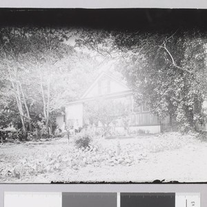 Charmian London sits on front steps of the cottage on Jack London Ranch. Title and date transcribed from envelope. Copy print of original. Print is overexposed.