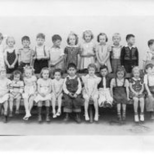 Photo--black and white: Sebastopol Grammar School first grade class photo of 1941. First grader Janet Woods (b. 1935) is on the top row, far left. Janet was the daughter of Blanche (Riddell) & Merton Woods, great granddaughter of Otis Allen, and great-great granddaughter of Thomas Sebring. Names of classmates: front row L-R: Caroleen Van Der Star, Alice Doughty, Marcia Barlow, Donna _____, Barbara Taylor, Paul Pete, Sue Abbott, Don Duckhorn, Calista Steadman, Norma Jean Helgren and Robert Wetch. Back row, L-R: Janet Woods, Grace Rust, Bob McDonald, Warren Powers, ?, Nadine Wetch, Audrey Bains, Joan Whitherall, Gerald_____, Chet Hammimoto, Tommy ______.