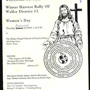 Women's day program, "The legacy of Godly women prevails through the 20th century", Winter Harvest Rally of Waller District #2, Bailey Chapel Church of God in Christ, Waller, Texas, 1994 January [sic, i.e. February) 24. [Description English/roman)]