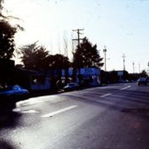 Print, color: Shops and merchants on Healdsburg Avenue looking west. Stores include Fish & Chips, Round Table Pizza and Benedetti Tire Service Goodyear. Circa 1970s. This whole area was previously an apple orchard.