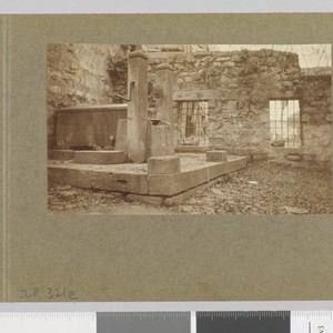 Ruins of stone mosque yard including stone well and masonry walls. Title transcribed from envelope. Date devised by cataloger. . Photo is affixed to board. Appears to be a small album that has been unbound. Includes typed labels describing images, only a few of which correspond with photos.