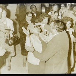 Photograph of a man healing a woman in a crowd, early 1960's. "Praying in the uper [sic] room. Elder D.L. Barron with with W.V. Grant, Sr., early 60's" -- written on back. [Description English/roman)]