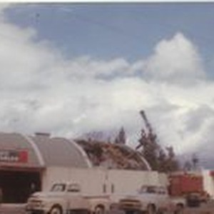 Photo--color: The Purity Market in the process of being torn down, about 1960. The Purity stood at the corner of McKinley and Main Streets in Sebastopol. The wrecking crane begins working on the roof of the store. Several pick-up trucks are in the parking lot. The 'half barrel' design was typical of Puirity Stores in California in the 1940s.