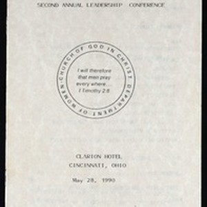 Leadership conference, International Women's Department, Church of God in Christ (2nd: 1990), "Church of God in Christ women equipping themselves for productive leadership", program, Clarion Hotel, Cincinnati, Ohio, 1990 May 28. [Description English/roman)]