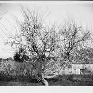Photo--black and white: Fruit trees at Burbank Gold Ridge Experiment Farm. Plum tree at Gold Ridge Experiment Farm in bloom. Tree identified as AA-3 east and west limbs of central branch. Circa 1928 Note: same tree in photos: 3065, 3070 and 3071.